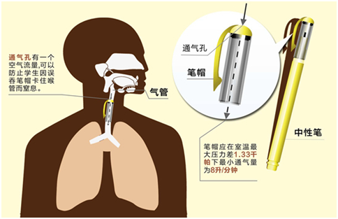 國(guó)家《學(xué)生用品的安全通用要求》明確規(guī)定,書(shū)寫(xiě)筆、記號(hào)筆、修正筆、水彩筆的筆帽應(yīng)至少符合筆帽尺寸(夠大則兒童不能吞咽下去)、筆帽通氣面積(留有小孔,如不慎吞下不至窒息)或筆帽空氣流通(有掛鉤之類(lèi)物體,在不慎被吞時(shí)可以保持一定的空氣流通)三項(xiàng)要求之一。